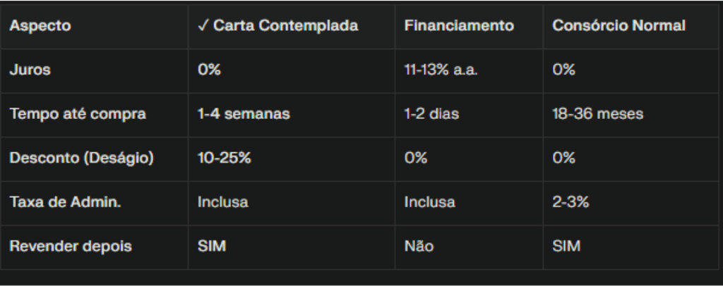 Consórcio Contemplado vs Financiamento vs Consórcio Normal