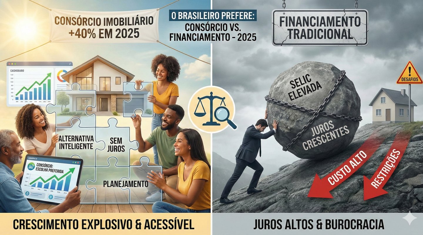 "Descubra por que consórcio imobiliário cresceu 40% em 2025. Comparação com financiamento, dados reais e como escolher a melhor opção para você."
