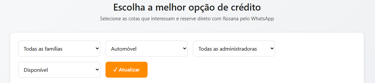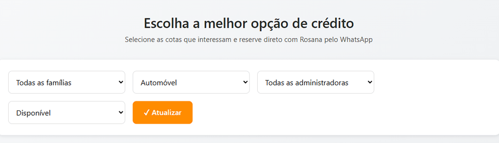 Clique no botão abaixo, para acessar a página de cotas contempladas disponíveis e use os filtros para selecionar as cotas que você precisa visualizar. Você pode filtrar por Tipo de Carta - Imóveis, Veículos ou Pesados, por administradora e por disponibilidade.